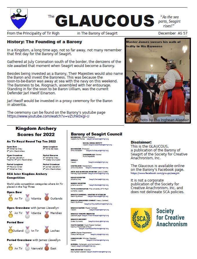 The Glaucous is the periodical newsletter of the Barony of Seagirt. Our latest edition: